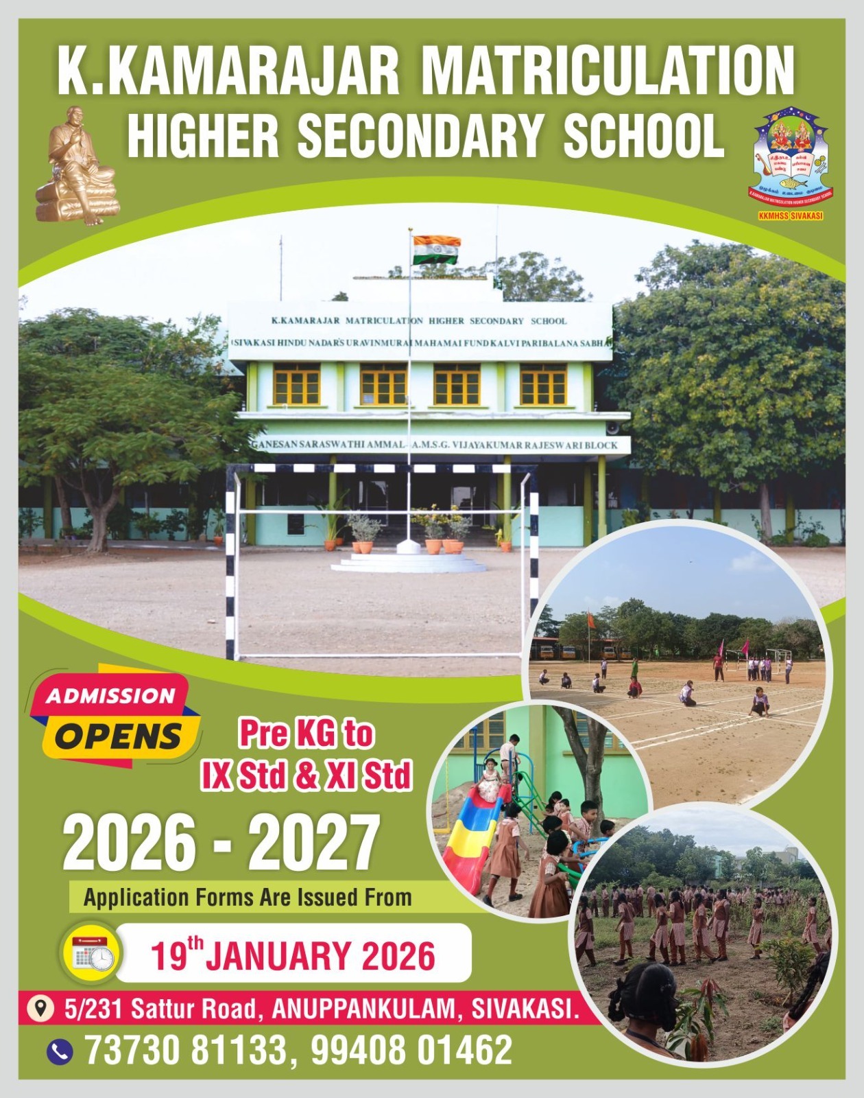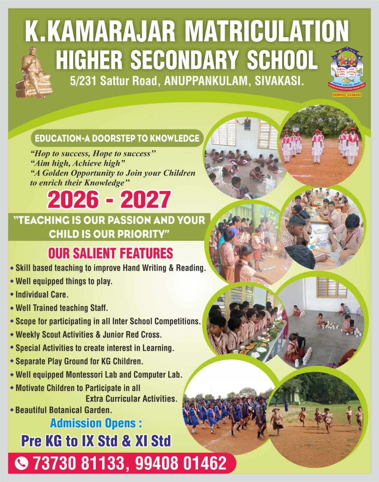 Education is making children capable of becoming responsible member of the society. The journey into the world of knowledge begins at school and it is here that the child hones his skills, sharpens his intellect and unleashes his creativity. At K. KAMARAJAR MATRIC. HR. SEC. SCHOOL, ANUPPANKULAM, SIVAKASI, We provide a wholesome environment for academic excellence and an education that goes beyond the four walls of the classrooms, that prepares the child to face challenges of complex, modern day living and ready to claim his rightful place as a good citizen.
